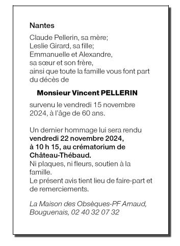 Décédé à Nantes (44000, France) le vendredi 15 novembre 2024 à l'âge de 60 ans
