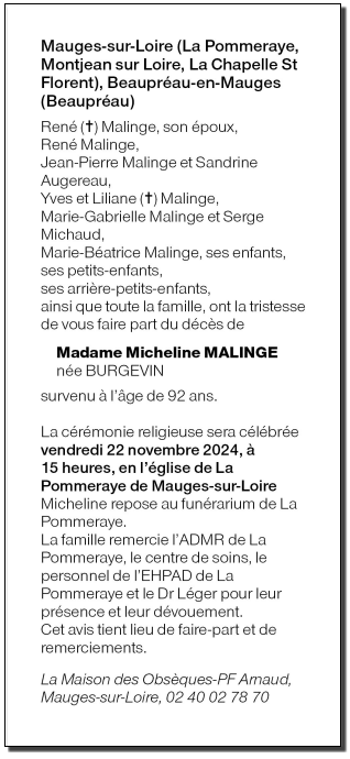 Décédée à La Pommeraye (49620, France) le mercredi 20 novembre 2024 à l'âge de 92 ans