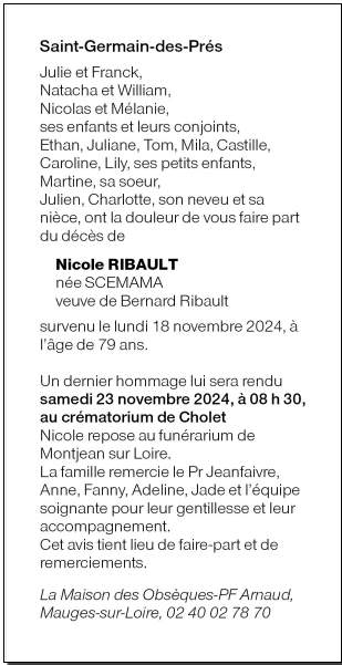 Décédée à Angers (49000, France) le lundi 18 novembre 2024 à l'âge de 79 ans