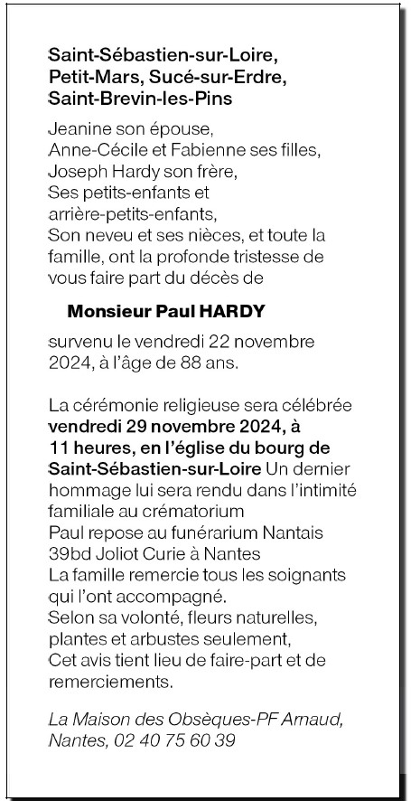 Décédé à Nantes (44000, France) le vendredi 22 novembre 2024 à l'âge de 88 ans