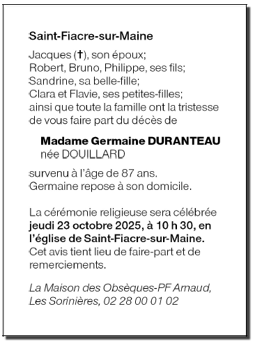 Décédée à Saint-Fiacre-sur-Maine (44690, France) le dimanche 19 octobre 2025 à l'âge de 87 ans