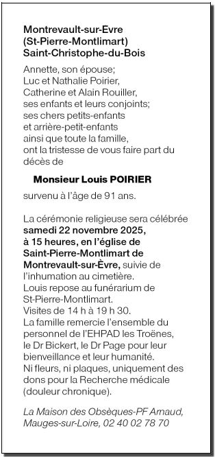 Décédé à Saint Pierre Montlimart (49110, France) le vendredi 14 novembre 2025 à l'âge de 91 ans