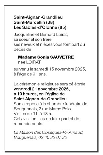 Décédée à Nantes (44200, France) le samedi 15 novembre 2025 à l'âge de 91 ans