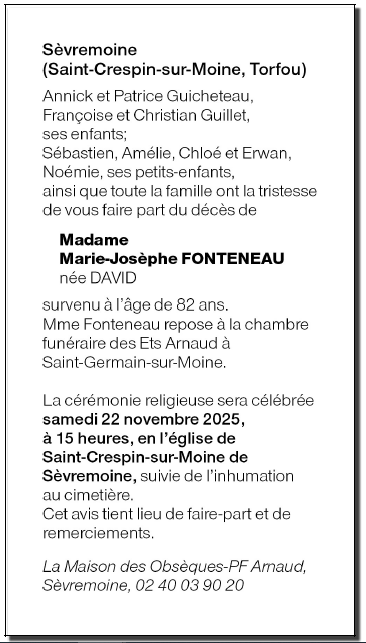 Décédée à Boussay (44190, France) le mercredi 19 novembre 2025 à l'âge de 82 ans