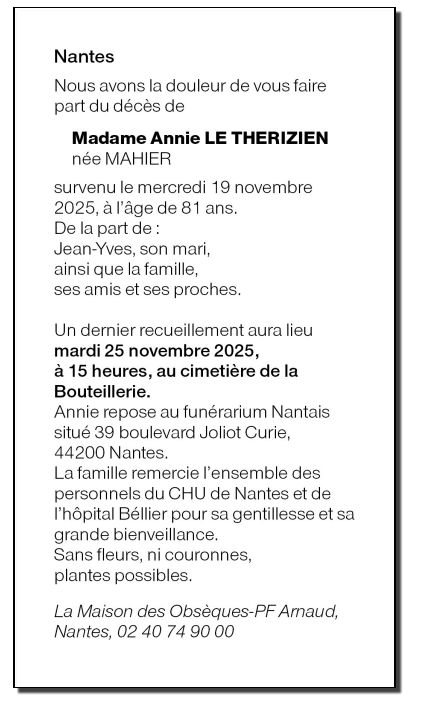 Madame Annie LE THERIZIEN née MAHIER