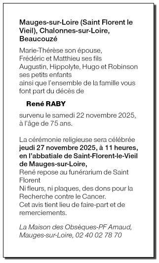 Décédé à Angers (49000, France) le samedi 22 novembre 2025 à l'âge de 75 ans