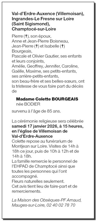 Décédée à Champtocé-sur-Loire (49123, France) le mercredi 14 janvier 2026 à l'âge de 85 ans
