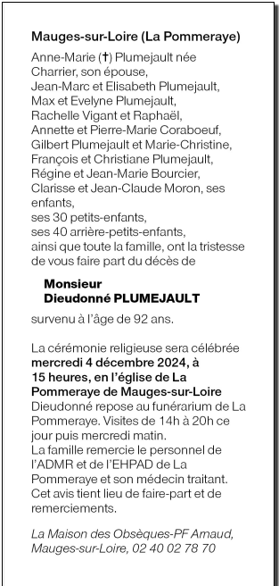 Décédé à La Pommeraye (49620, France) le lundi 2 décembre 2024 à l'âge de 92 ans