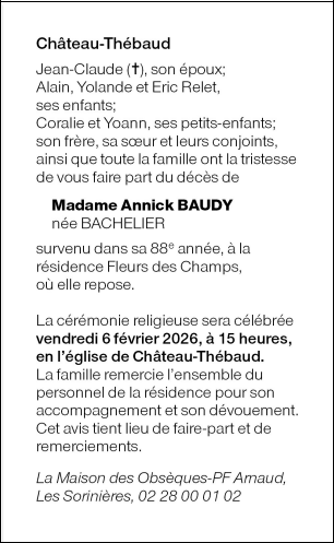Décédée à La Planche (44140, France) le dimanche 1 février 2026 à l'âge de 87 ans