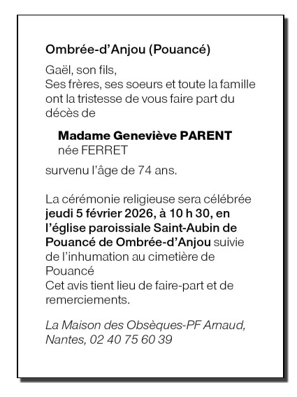 Décédée à Nantes (44000, France) le vendredi 30 janvier 2026 à l'âge de 74 ans