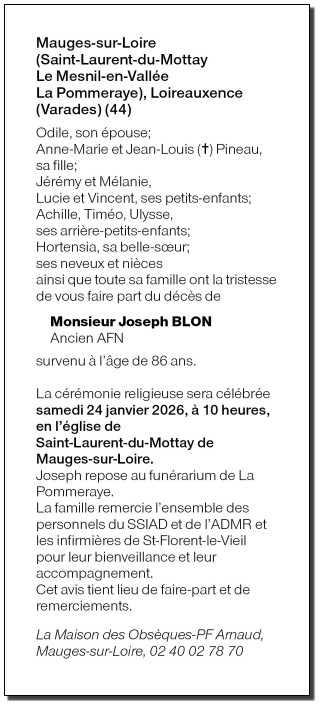Décédé à Saint Laurent du Mottay (49410, France) le mardi 20 janvier 2026 à l'âge de 86 ans