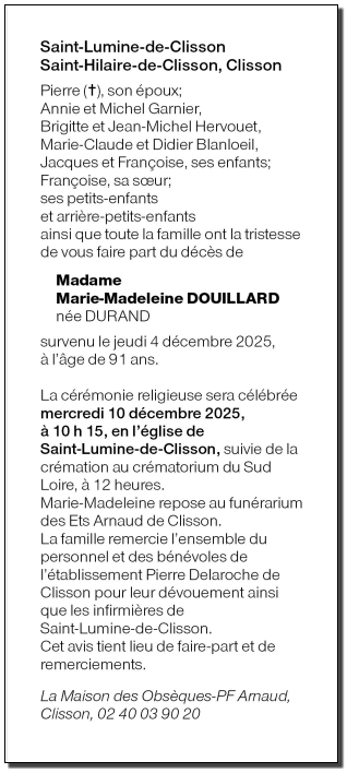 Décédée à Clisson (44190, France) le jeudi 4 décembre 2025 à l'âge de 91 ans