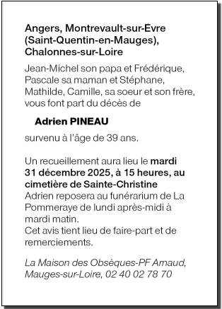 Décédé à Angers (49000, France) le jeudi 26 décembre 2024 à l'âge de 39 ans