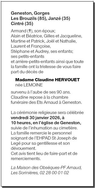 Décédée à Legé (44650, France) le lundi 26 janvier 2026 à l'âge de 89 ans