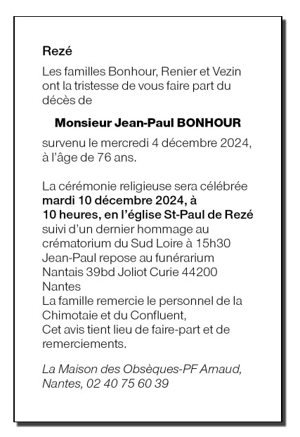Décédé à Nantes (44200, France) le mercredi 4 décembre 2024 à l'âge de 76 ans