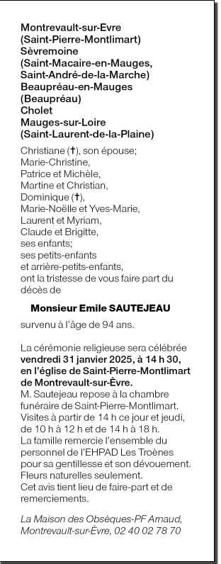 Décédé à Saint Pierre Montlimart (49110, France) le mardi 28 janvier 2025 à l'âge de 94 ans