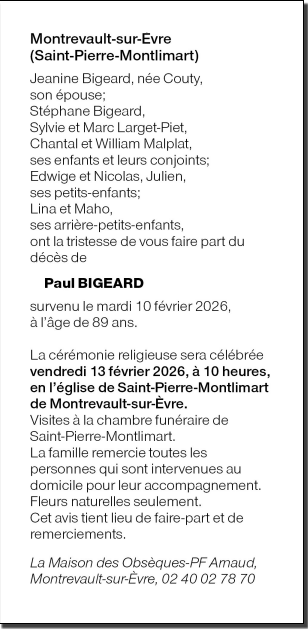 Décédé à Cholet (49300, France) le mardi 10 février 2026 à l'âge de 89 ans