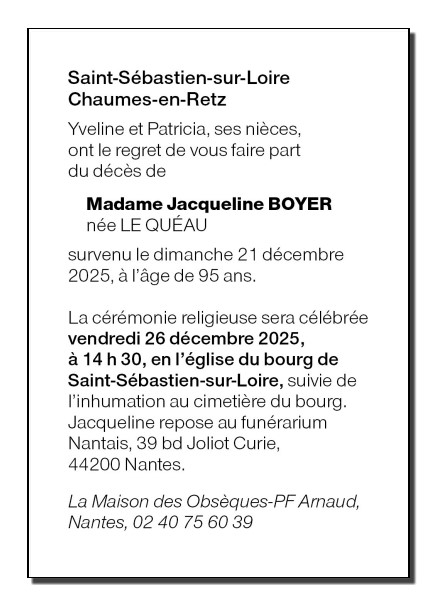 Décédée à Saint-Herblain (44800, France) le dimanche 21 décembre 2025 à l'âge de 95 ans