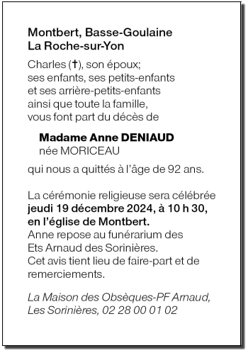 Décédée à Geneston (44140, France) le dimanche 15 décembre 2024 à l'âge de 92 ans
