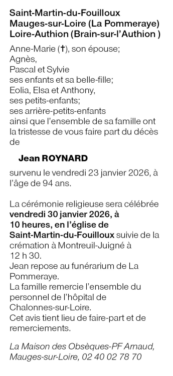 Décédé à Chalonnes-sur-Loire (49290, France) le vendredi 23 janvier 2026 à l'âge de 94 ans