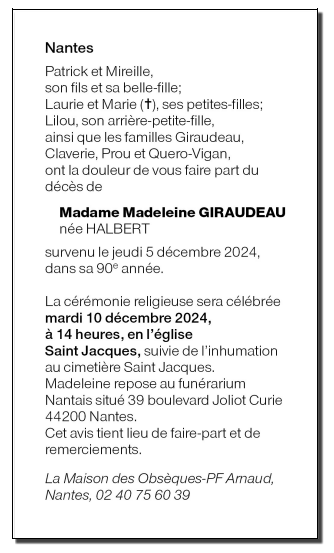 Décédée à Haute-Goulaine (44115, France) le jeudi 5 décembre 2024 à l'âge de 89 ans