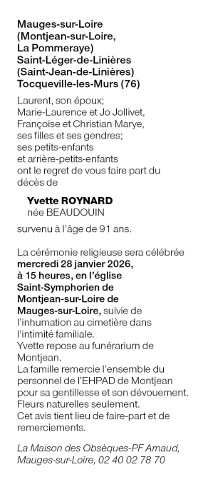 Décédée à Montjean sur Loire (49570, France) le vendredi 23 janvier 2026 à l'âge de 91 ans