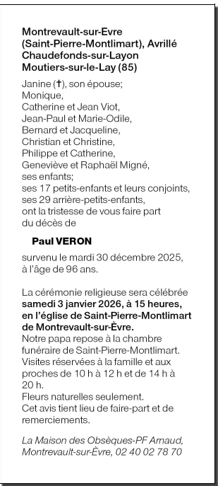 Décédé à Cholet (49300, France) le mardi 30 décembre 2025 à l'âge de 96 ans