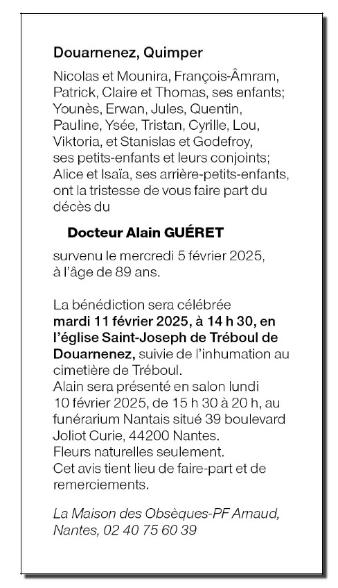 Décédé à Nantes (44200, France) le mercredi 5 février 2025 à l'âge de 89 ans