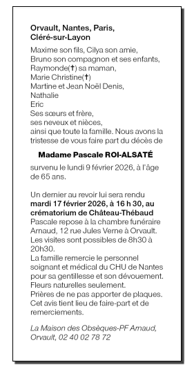 Décédée à Nantes (44000, France) le lundi 9 février 2026 à l'âge de 65 ans