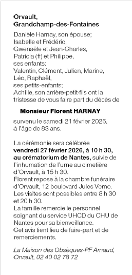 Décédé à Nantes (44000, France) le samedi 21 février 2026 à l'âge de 83 ans