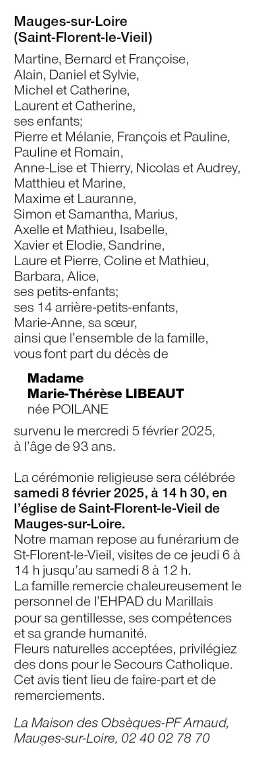 Décédée à Le Marillais (49410, France) le mercredi 5 février 2025 à l'âge de 93 ans