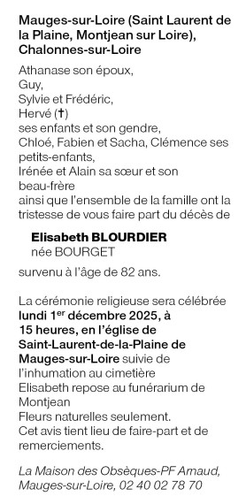 Décédée à Mauges-sur-Loire (49570, France) le jeudi 27 novembre 2025 à l'âge de 82 ans