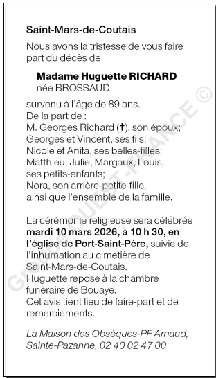 Décédée à Saint-Mars-de-Coutais (44680, France) le vendredi 6 mars 2026 à l'âge de 89 ans