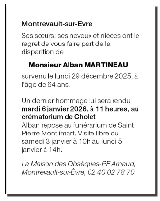 Décédé à Montrevault-sur-Èvre (49110, France) le lundi 29 décembre 2025 à l'âge de 64 ans