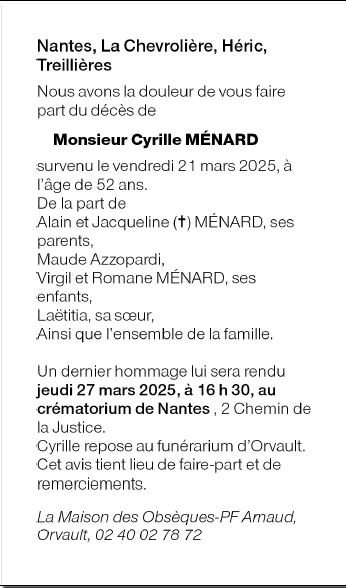 Décédé à Vertou (44120, France) le vendredi 21 mars 2025 à l'âge de 52 ans