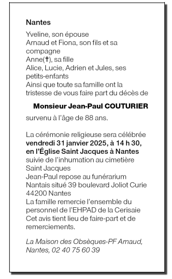 Décédé à Nantes (44200, France) le samedi 25 janvier 2025 à l'âge de 88 ans