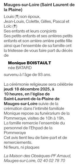 Décédée à La Pommeraye (49620, France) le samedi 13 décembre 2025 à l'âge de 93 ans