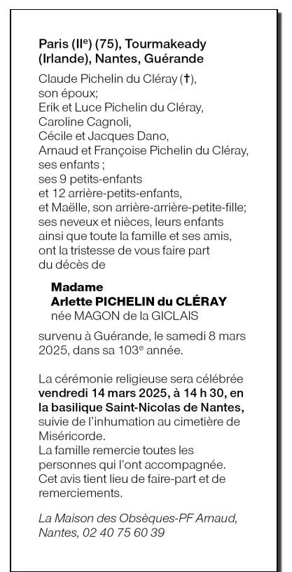 Décédée à Guérande (44350, France) le samedi 8 mars 2025 à l'âge de 102 ans
