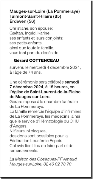 Décédé à La Pommeraye (49620, France) le mercredi 4 décembre 2024 à l'âge de 74 ans