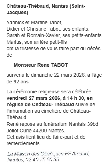 Décédé à Rezé (44400, France) le dimanche 22 mars 2026 à l'âge de 92 ans