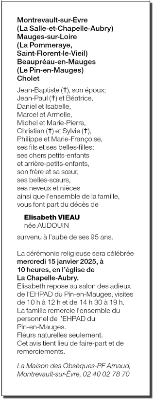 Décédée à Le Pin en Mauges (49110, France) le vendredi 10 janvier 2025 à l'âge de 94 ans