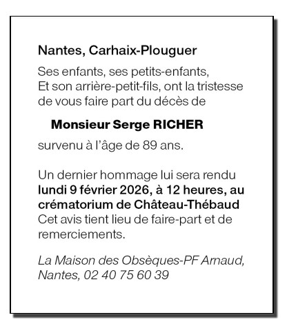 Décédé à Nantes (44200, France) le samedi 31 janvier 2026 à l'âge de 89 ans