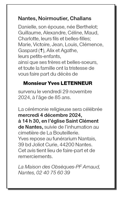 Décédé à Nantes (44000, France) le vendredi 29 novembre 2024 à l'âge de 85 ans