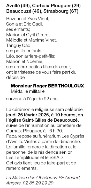 Décédé à Angers (49000, France) le vendredi 20 février 2026 à l'âge de 92 ans