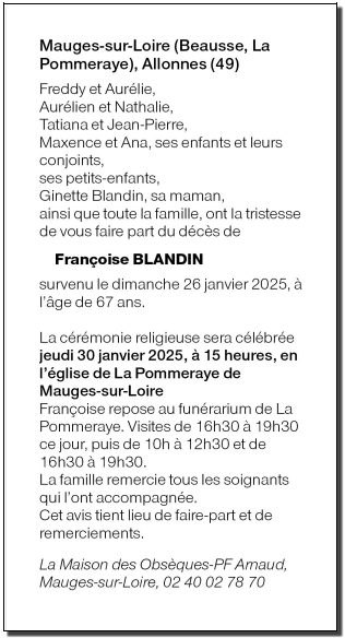 Décédée à Angers (49000, France) le dimanche 26 janvier 2025 à l'âge de 67 ans