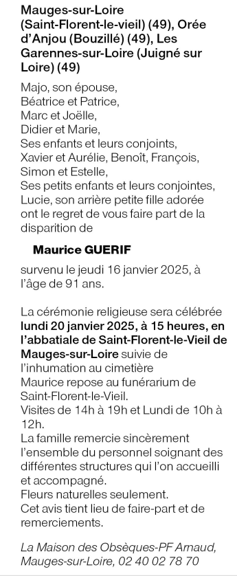 Décédé à Saint-Georges-sur-Loire (49170, France) le jeudi 16 janvier 2025 à l'âge de 91 ans