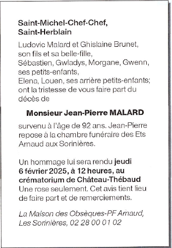 Décédé à Les Sorinières (44840, France) le jeudi 30 janvier 2025 à l'âge de 92 ans