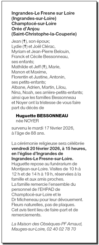 Décédée à Champtocé-sur-Loire (49123, France) le mardi 17 février 2026 à l'âge de 88 ans