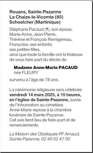 Décédée à La Chevrolière (44118, France) le lundi 10 mars 2025 à l'âge de 78 ans