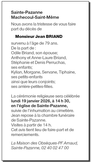 Décédé à Sainte-Pazanne (44680, France) le mercredi 14 janvier 2026 à l'âge de 79 ans